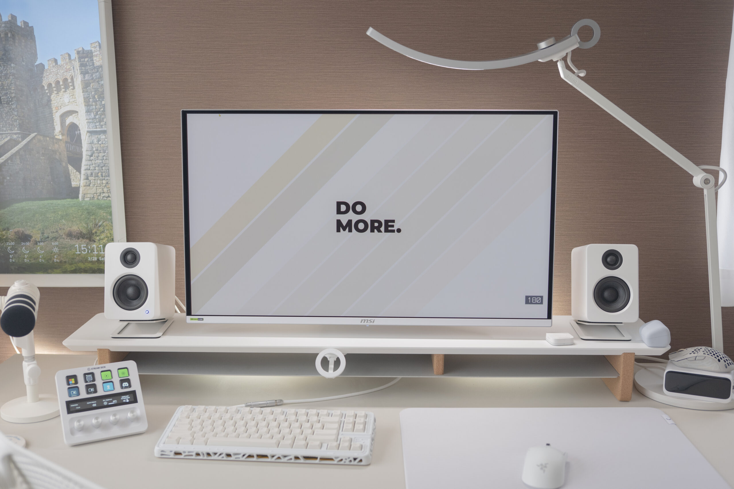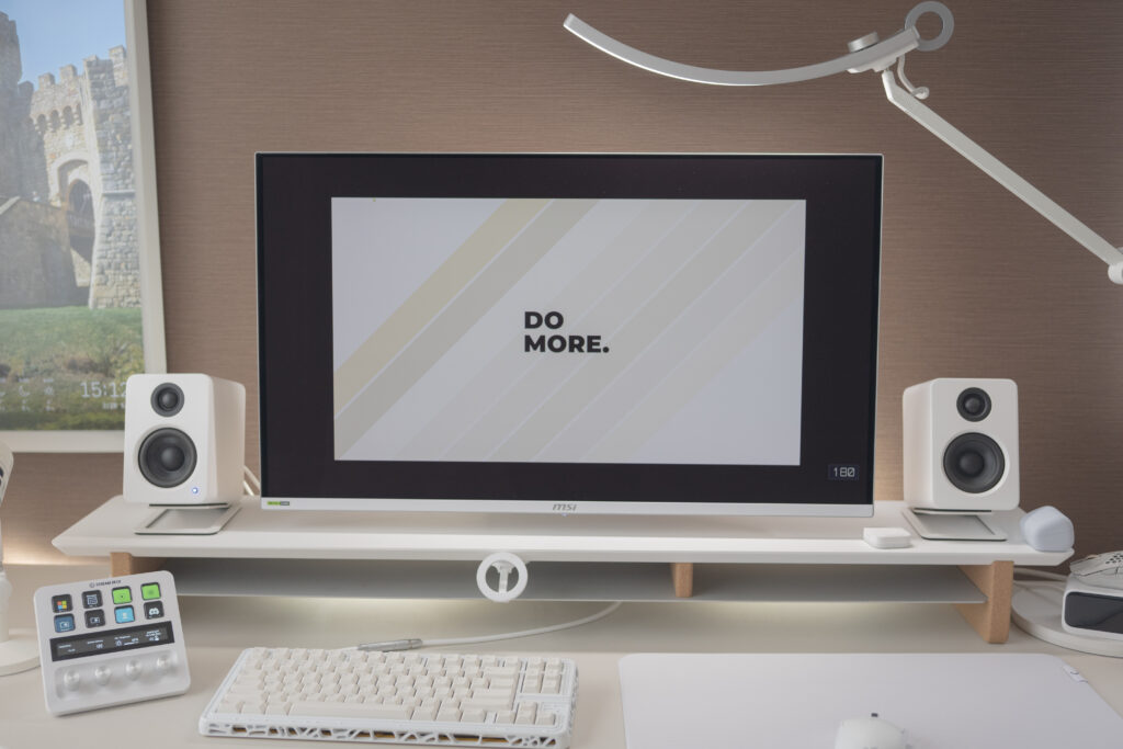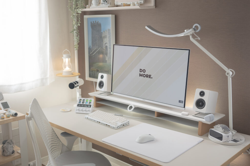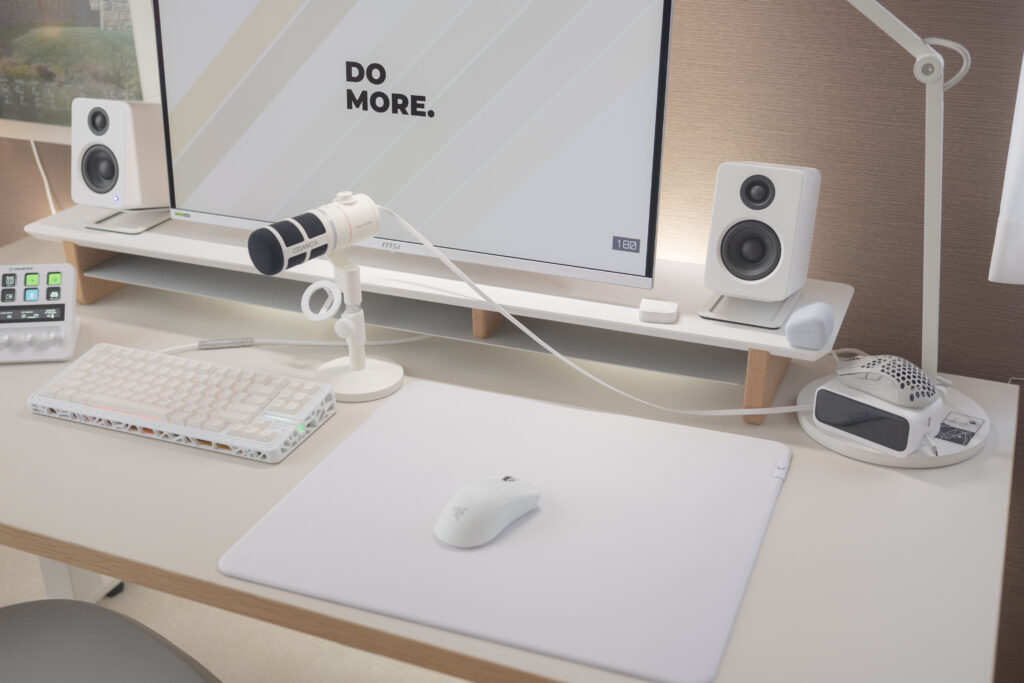 モニターは、白とシルバーのデザインが美しいMSIの「有機EL」モニター。ずっと有機ELは使ってみたいと思っていたのですが、見た目も機能性も満足できる1台でした。