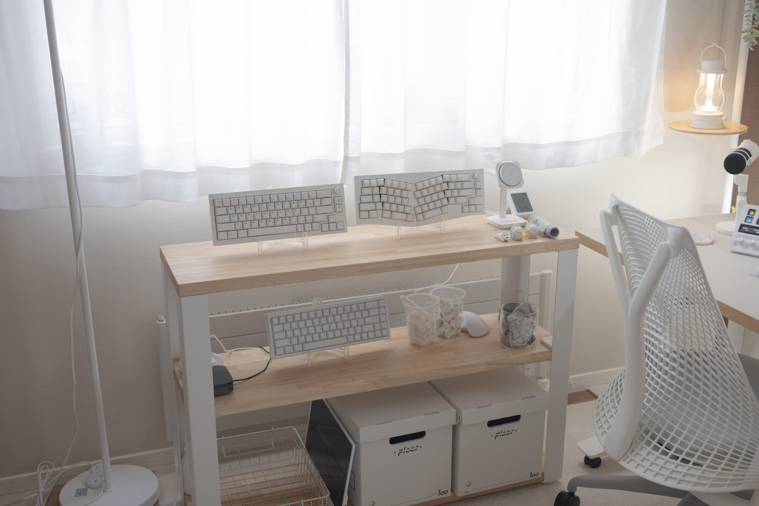 デスク横に置くのは、KANADEMONOのシェルフ。デスク横にナチュラルな要素を取り入れつつ、大好きなキーボードのディスプレイとして使用しています。