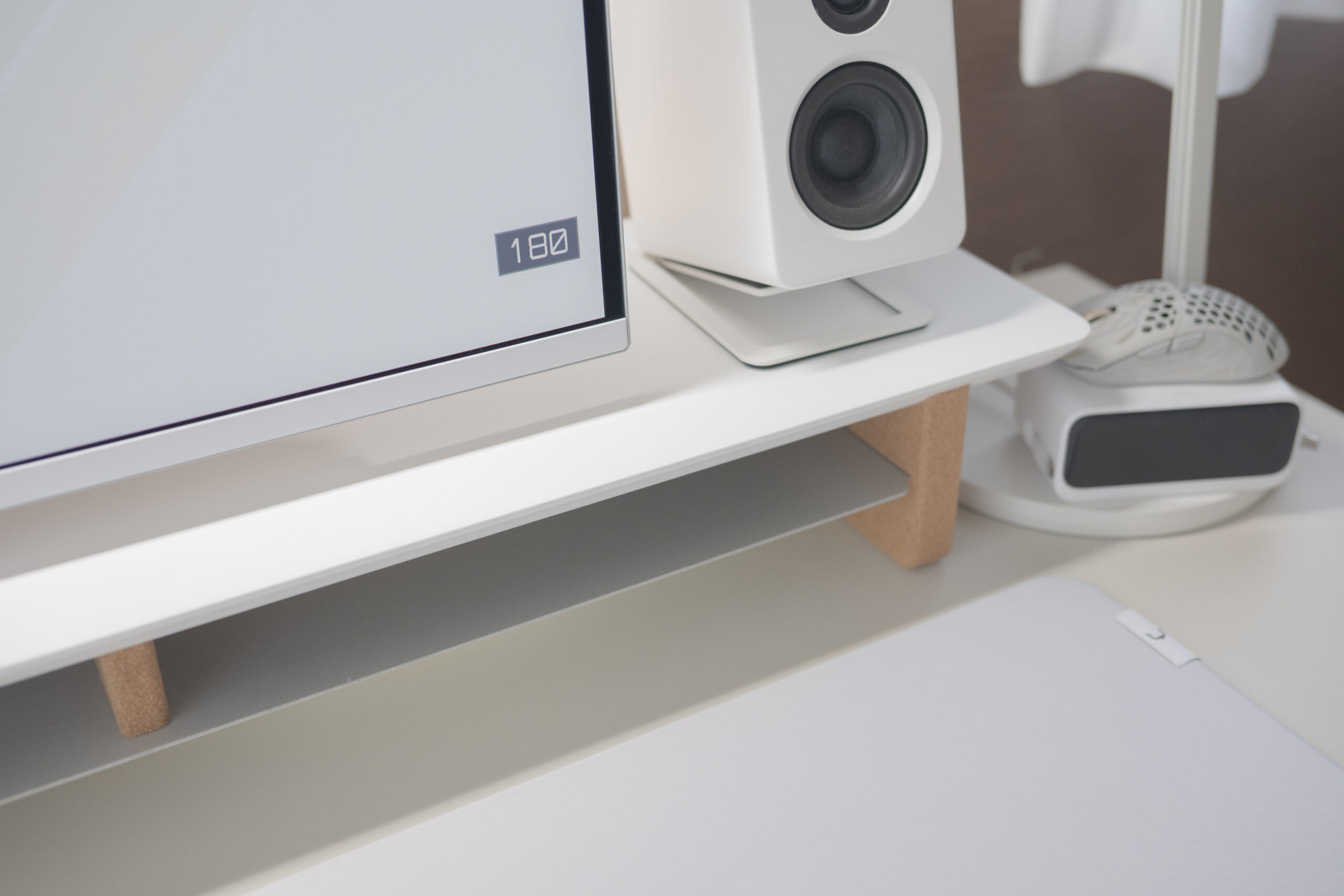 モニターを適切な高さに上げ、その下にキーボードや小物を収めることで、デスクに貴重な「余白」を生み出してくれるデスクシェルフ。