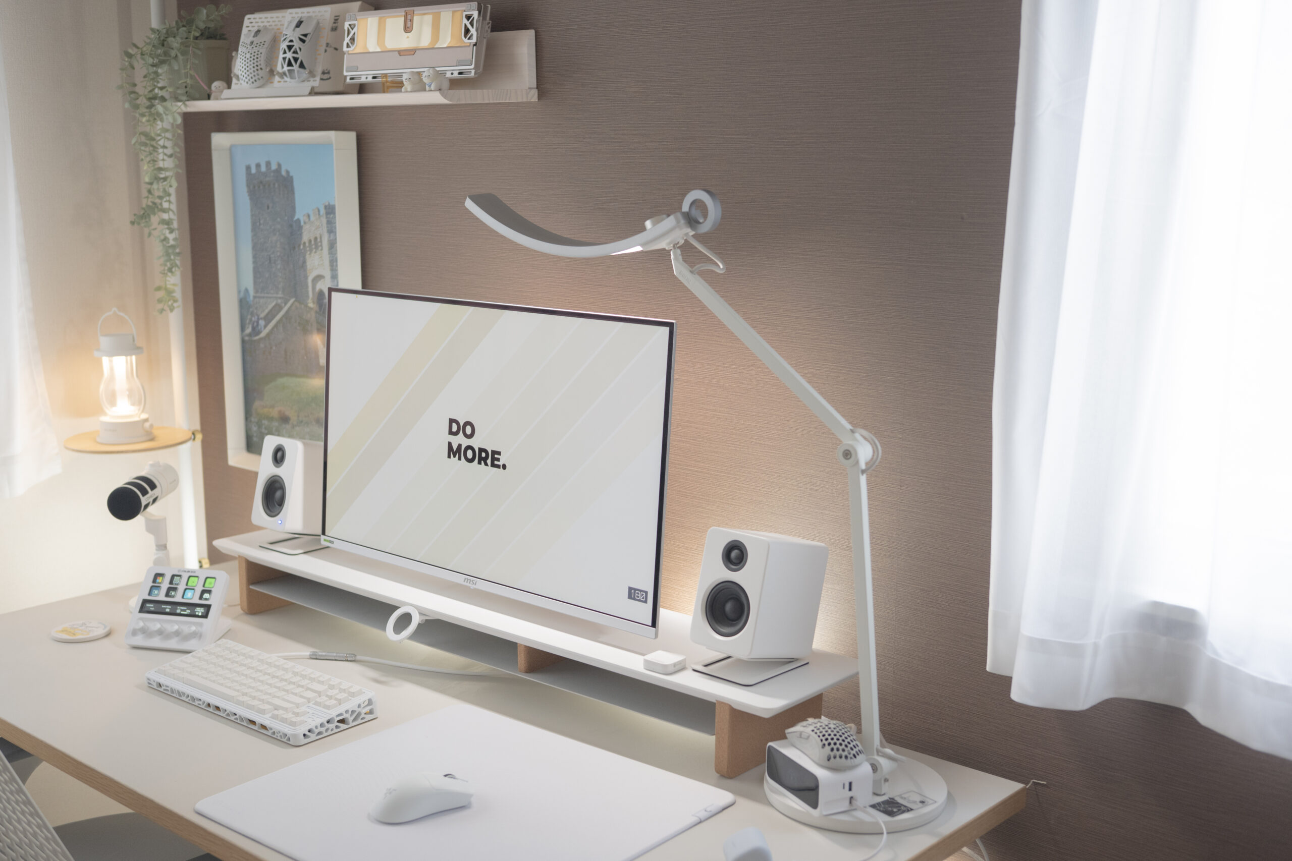 少し風変わりな、この湾曲したモニターライト。ライト部そのものが描く美しいカーブと、そこから漏れる柔らかな光が、今の僕のデスクを象徴とも言えます。