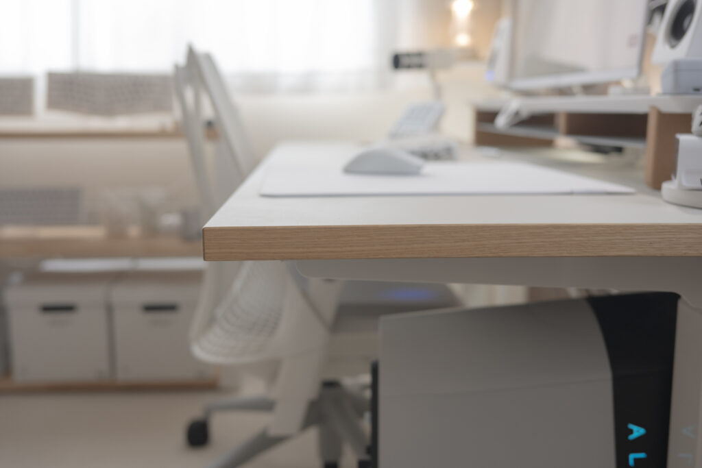 奥行きを75cmに広げたことで、デスクの上に程よい「余白」が生まれました。側面の木目も見えるデザインもお気に入りで、デスク天板は他となかなか被らない「自分らしさ」がポイントです。