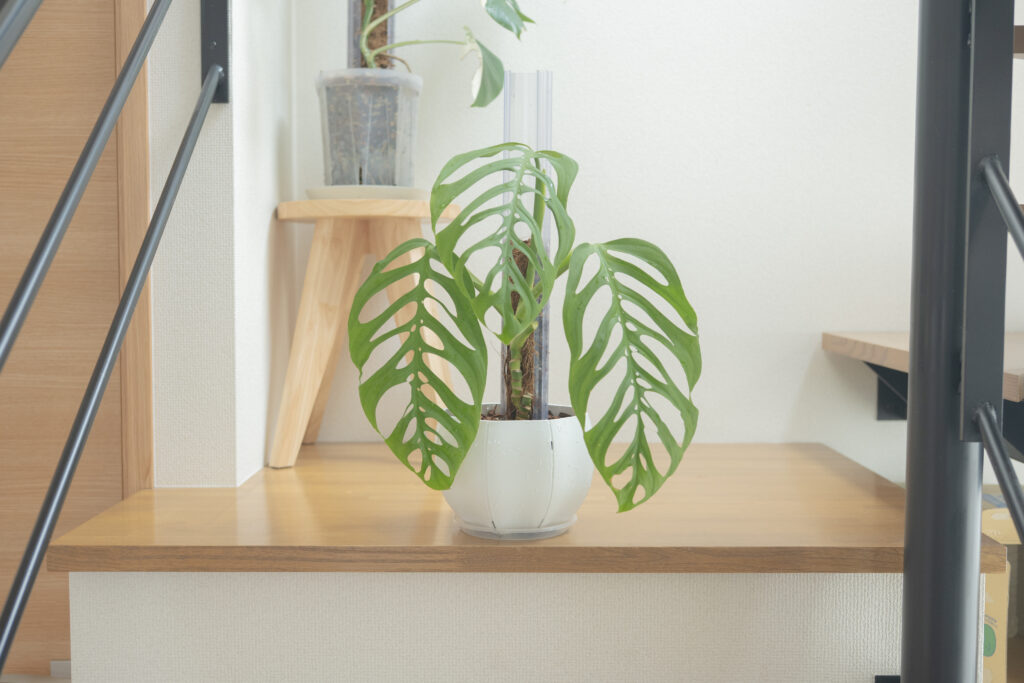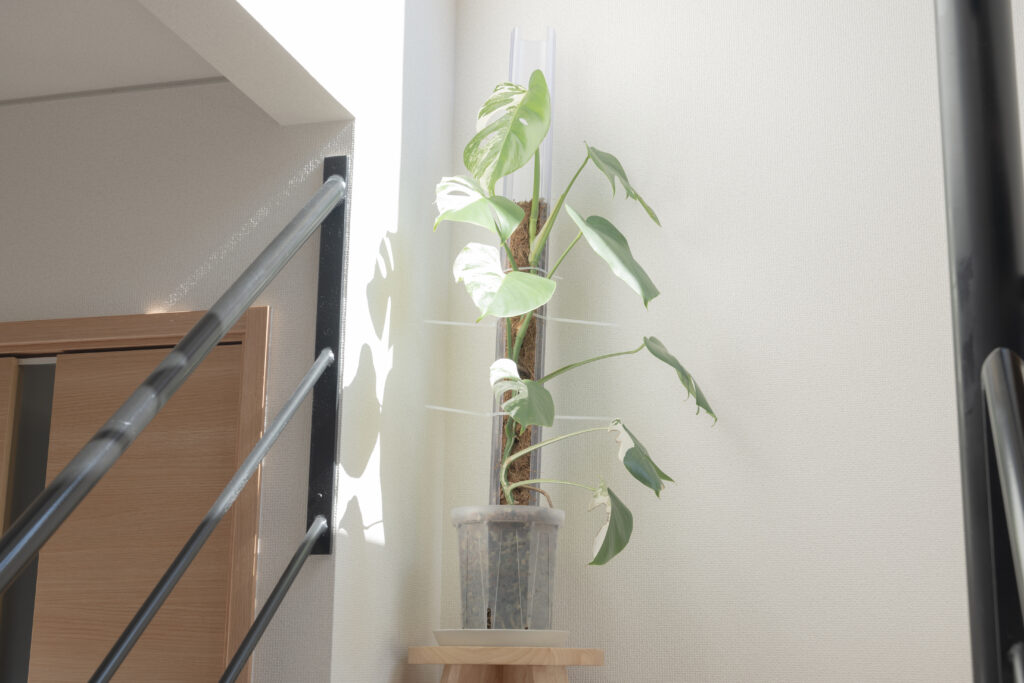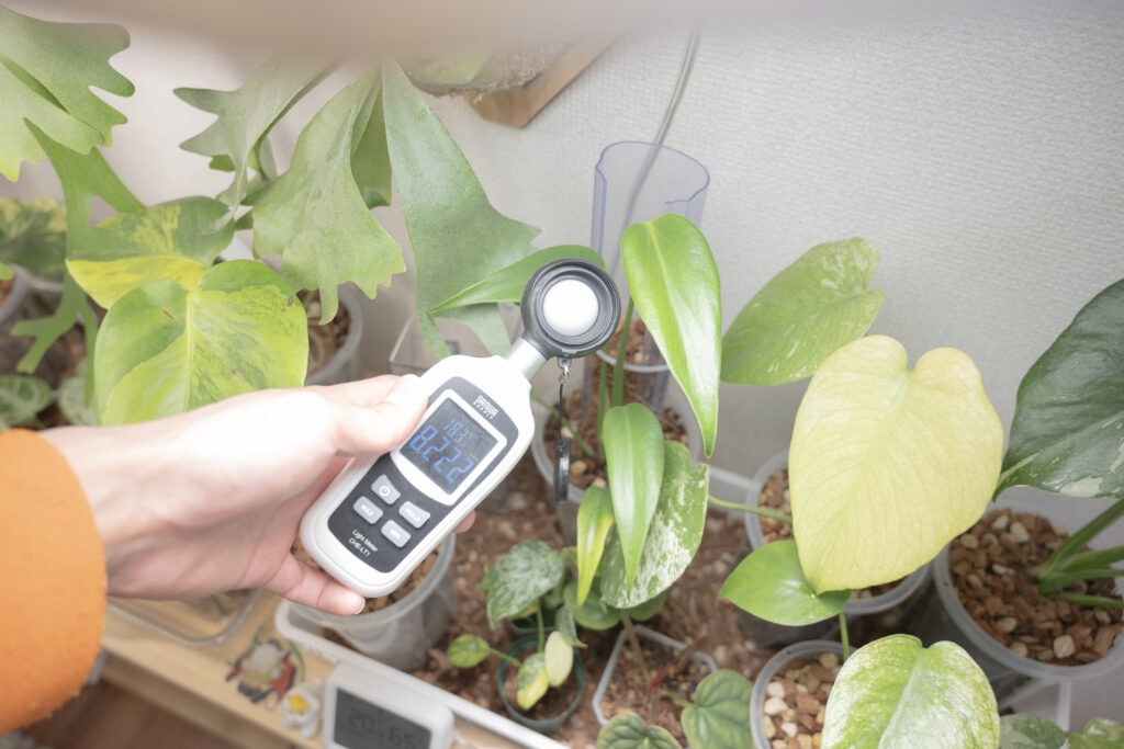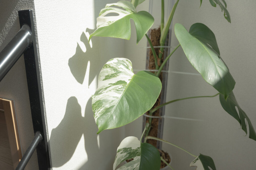 モンステラは、いずれもリビングで日中光を当てており、約7000〜10000ルクスの光を当て続けています。やはり光をしっかり当てることで、葉や茎が丈夫になって育つ印象があるのでとても重要。