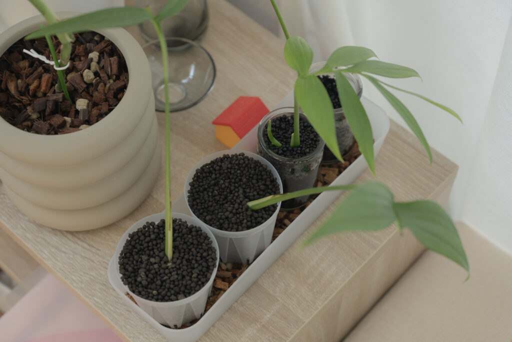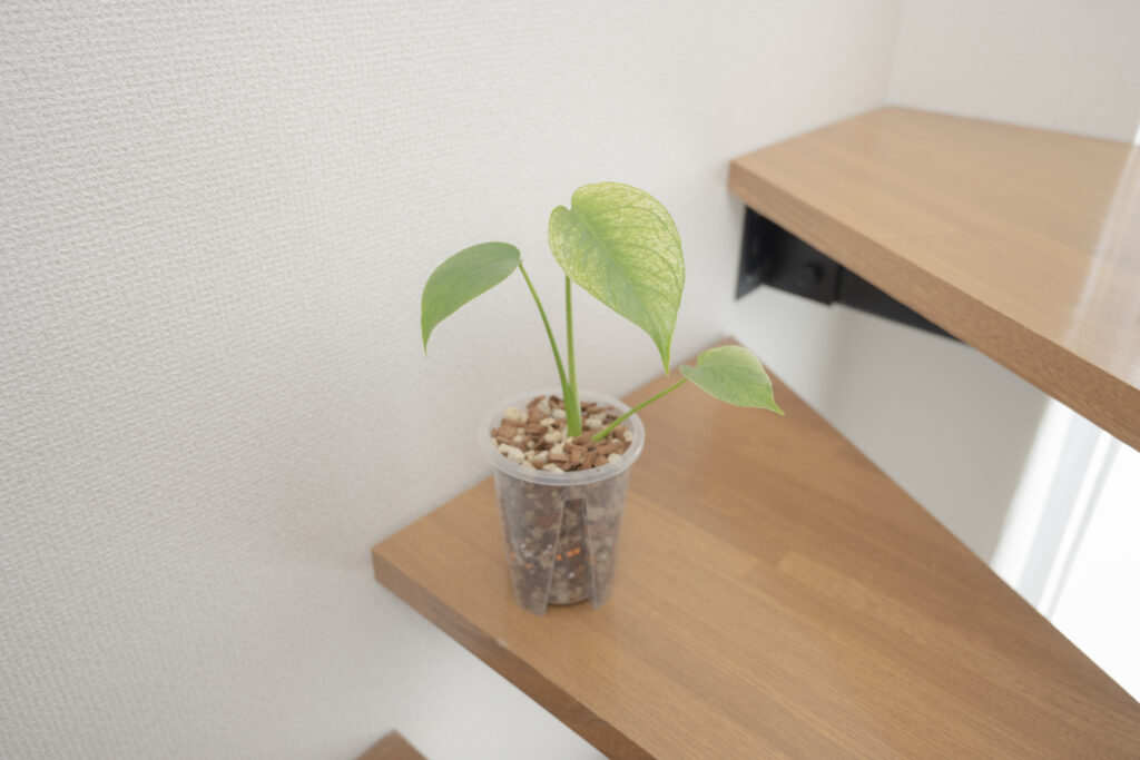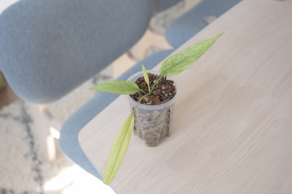 成長を促進させるためにも、「プラスチックで穴の多いポット」×「水はけのいい土(ねこチップ)」で育てています。1週間に2度は水やりを行なっていて、2回に1回は規定量よりも薄めた液肥を混ぜて与えています。特に透明なポットは、葉の成長に加えて「根の成長も楽しめる」のでおすすめです。