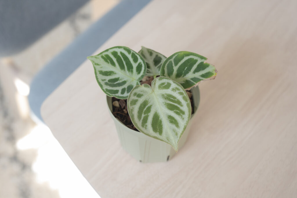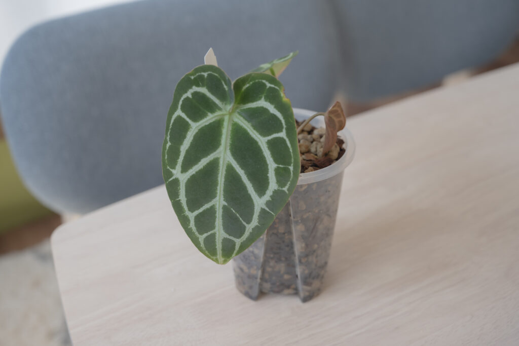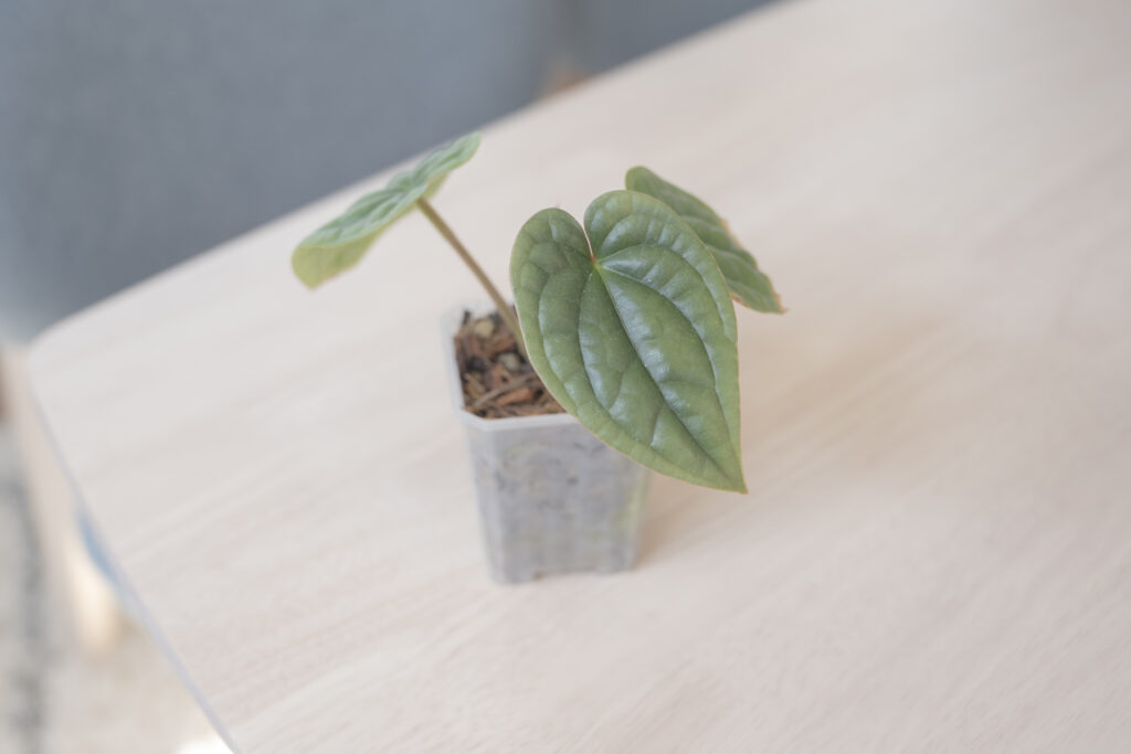 アンスリウムの中でも育てやすく、まずはここからという方も多い「クリスタリナム」。私が選んだのは、その中でも葉が深みのある濃い緑に染まる「ダークフォーム」という個体です。